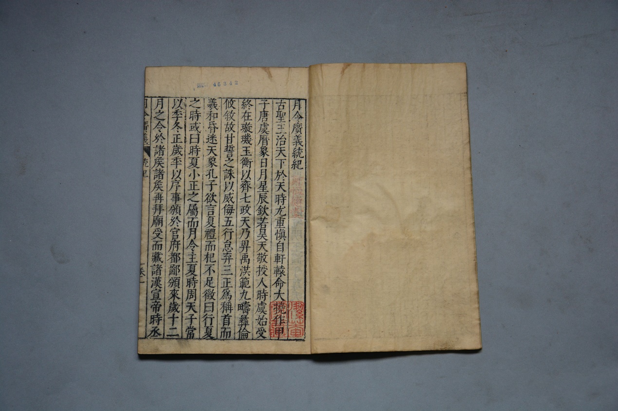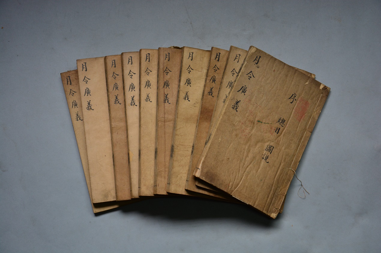 《月令广义》:一函10册,外形尺寸通长26.6cm,通宽17cm,通高9.3cm。明万历三十年(1602)刻本。是明代冯应京编纂, 戴任续成。综合论述天文和气候等,按月令记述事物的农书,也是中国古代可查最早的地理气候论书籍。全书共二十四卷。卷首收《山海舆地全图》、《授时图》、《天文图》、《十四气七十二候图》等30余幅。此本为万历三十年秣陵陈邦泰刻本。购于济南古书店。现存于山东农业大学图书馆。