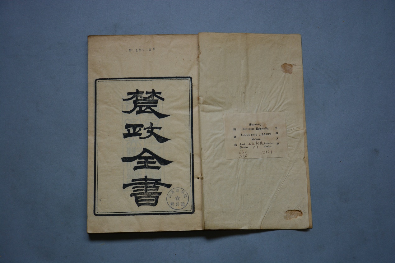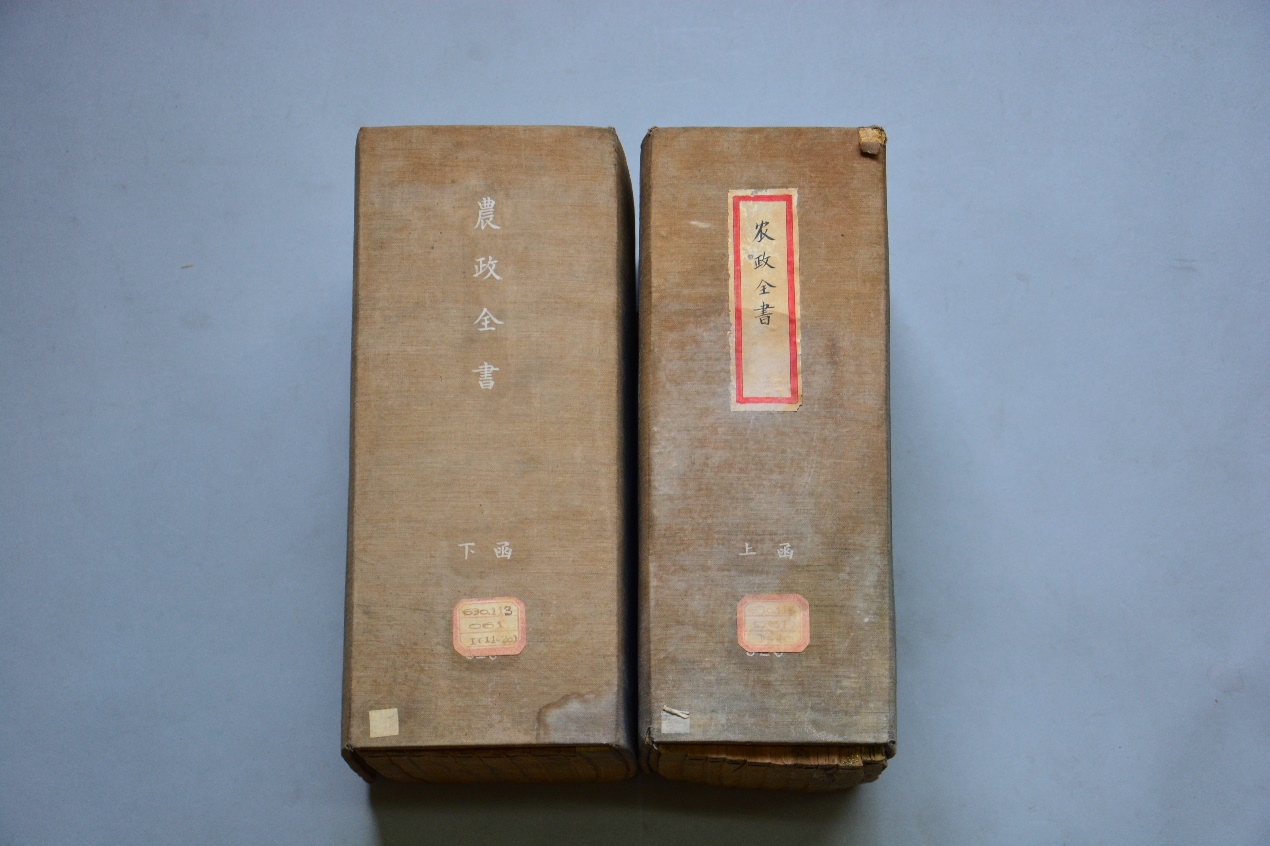 《农政全书》:二函20册,外形尺寸通长27.8cm,通宽17.2cm,通高20cm。清同治十三年(1874)刻本。徐光启(1562-1633)纂辑,成书于明万历年间,基本上囊括了中国明代农业生产和人民生活的各个方面,是研究关于古代农业的百科全书。来源于齐鲁大学图书馆。现存于山东农业大学图书馆。