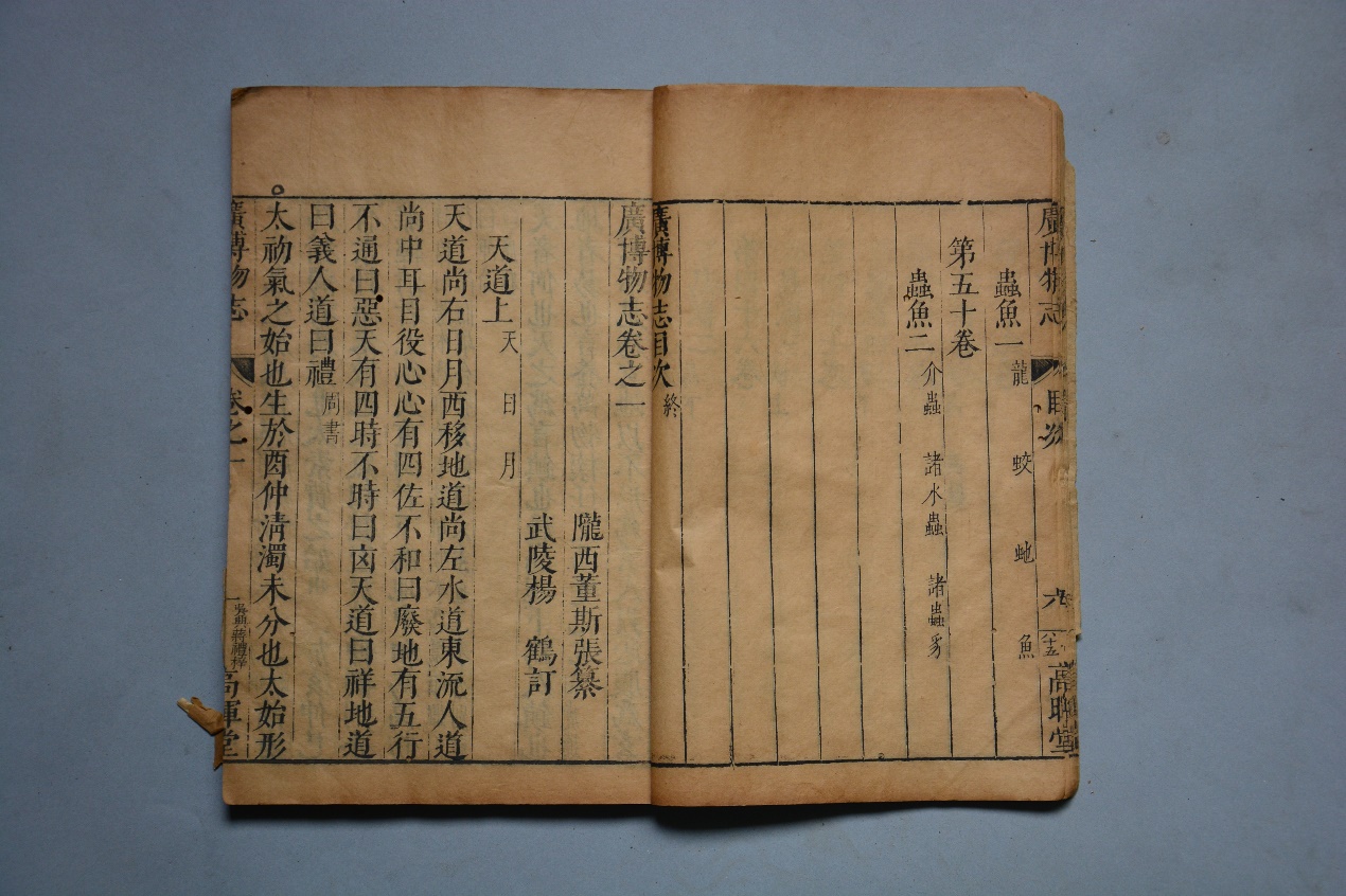 2《广博物志》:二函20册,外形尺寸通长26cm,通宽17cm,通高21cm,明万历三十五年(1607)浙江湖州诗人、监生,董斯张(1587—1628)撰。“明代小说”部分将《广博物志》归为“博物类志怪小说”,并认为其“扩展了晋张华《博物志》的范围和内容”,以卷帙浩繁、取材丰富、类目新颖等特点,发展了文言小说中的博物流派。1964年购于济南古籍书店,现存于山东农业大学图书馆。