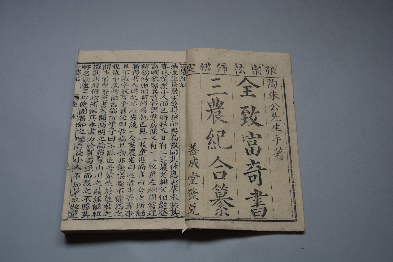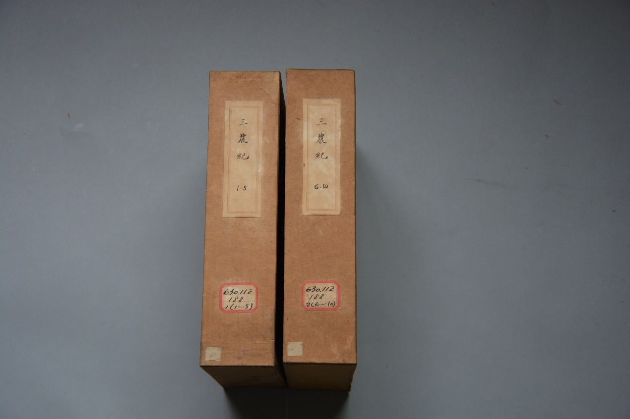 3《三农纪》:二函10册,外形尺寸通长23cm,通宽15.5cm,通高8cm,清代乾隆二十五年(1760)刻本,四川什邡人张宗法撰写一部综合性农学巨著。结合清代四川农业特色所撰述的一部反映大农业思想的农业著作,是研究清代四川农业问题的重要文献。书名因其是在“老农”、“ 牧童”、“耕夫”的规劝鼓励之下著书的,故名之《三农纪》。1958年收藏。现存于山东农业大学图书馆。