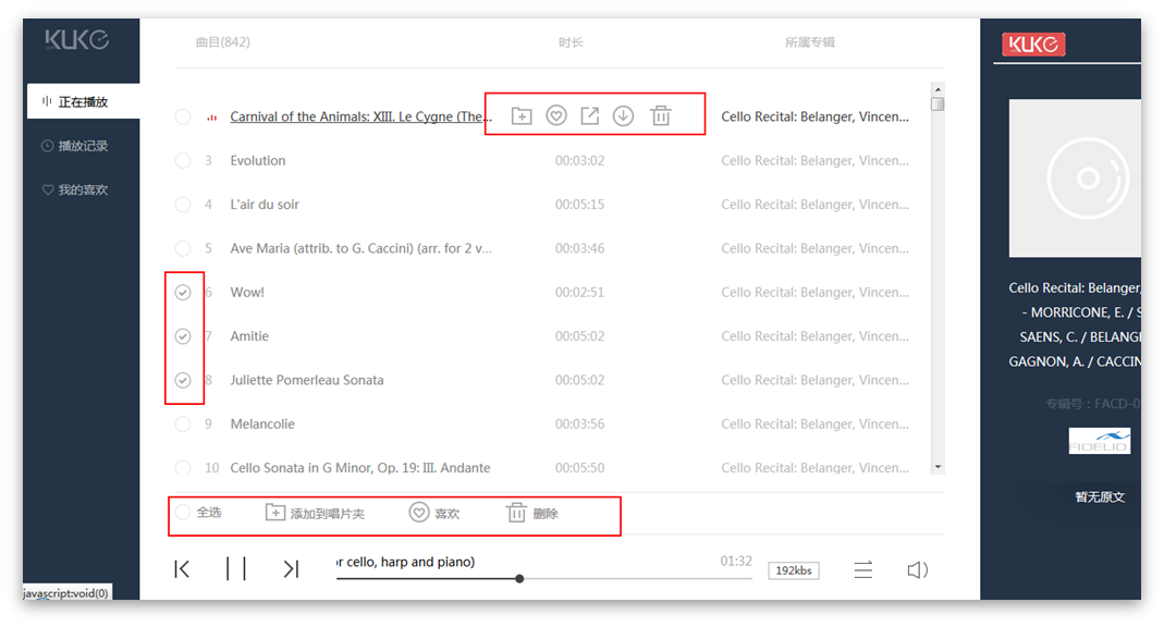 数据库具有收藏、分享、下载、删除及勾选多首单曲批量进行编辑等功能,还可以对喜欢的单曲、唱片进行查看、播放、删除,以及进行上一曲、下一曲、暂停播放、调进度等操作。用户可订阅感兴趣的艺术家或厂牌。