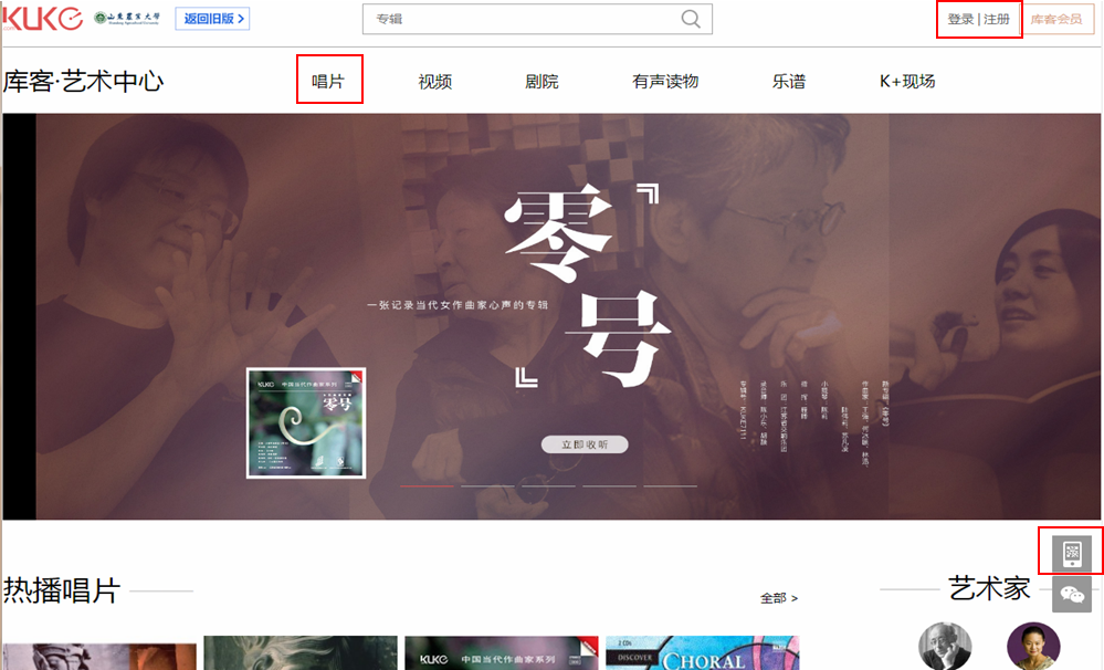 用户在IP范围内PC端进入该数据库首页注册后,登录库客手机APP(扫描下方二维码下载手机APP),可将喜欢的唱片、单曲添加到自行创建的唱片夹内,不受IP限制,随时随地享受高雅音乐。