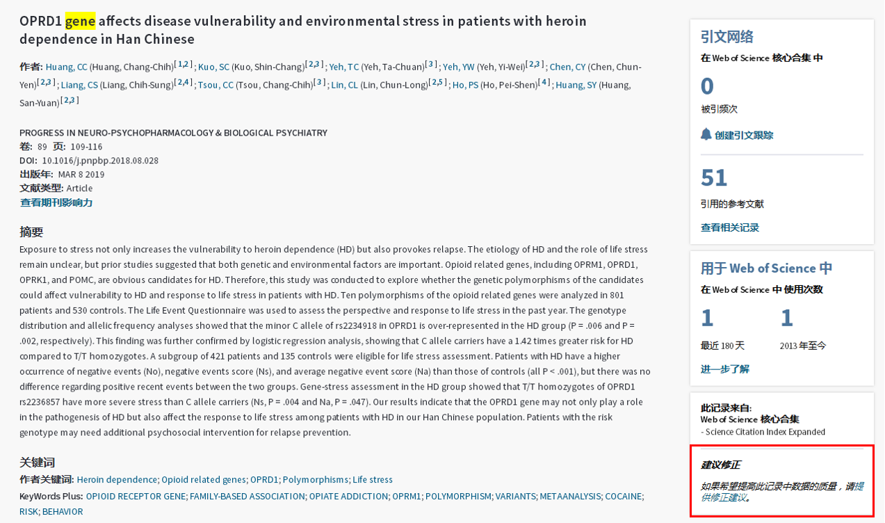 d.在原文没有明确标注任何通讯作者的情况下,我们可能会认为留有email地址的作者或者第一作者是通讯作者。如果您认为我们录入的不是真正的通讯作者,请先联系期刊出版社发表一个正式的说明或勘误,然后再联系我们将这个信息录入到Web of Science 核心合集中。