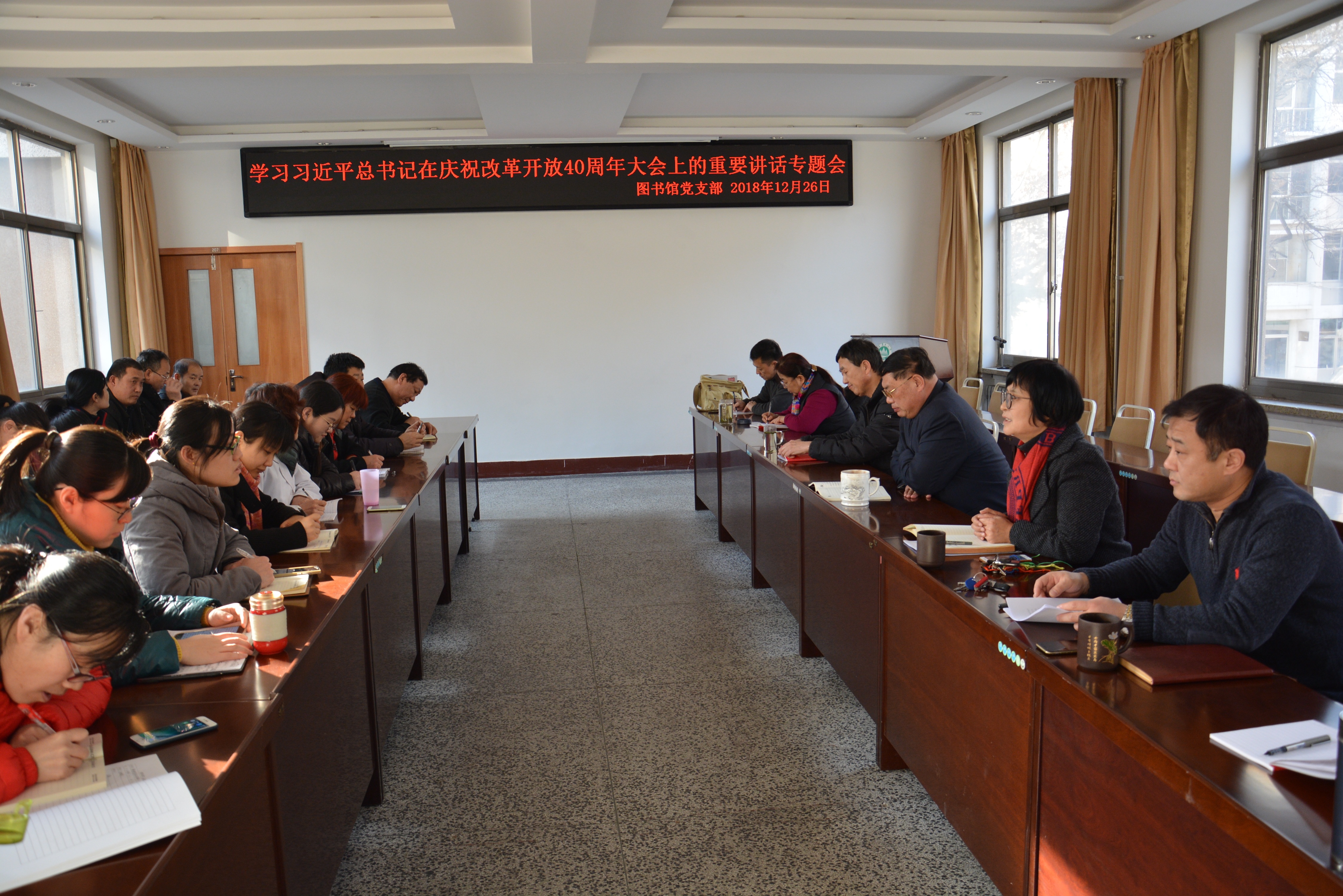 12月26日,图书馆党支部召开全体党员会议,专题学习习近平总书记在庆祝改革开放40周年大会上的重要讲话精神并交流学习体会。厉春宣书记主持会议,于军生副书记领学讲话全文。