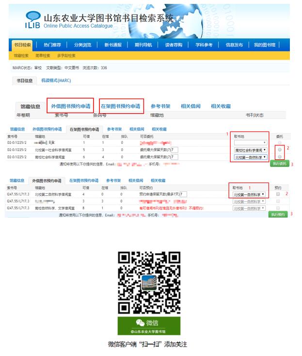 获取服务方式为:在图书馆网站书目检索页面检索到所需图书后,点击“外借图书预约申请”或“在架图书预约申请”。未登陆“我的图书馆”时则会弹出登录框,输入个人账号、密码登录后,按照所需选择“取书地”,选中图书后点击“执行”按钮即可。预约相关信息出现在“我的图书馆”和图书馆微信官方公众号的“服务——图书借阅”功能卡页面。请读者关注图书馆馆官方公众号,或更新“我的图书馆”中个人常用E-mail,以及时获取相关服务提示。如有疑问可咨询图书馆系统建设部施老师、姚老师,联系电话:8242879(62879)。
