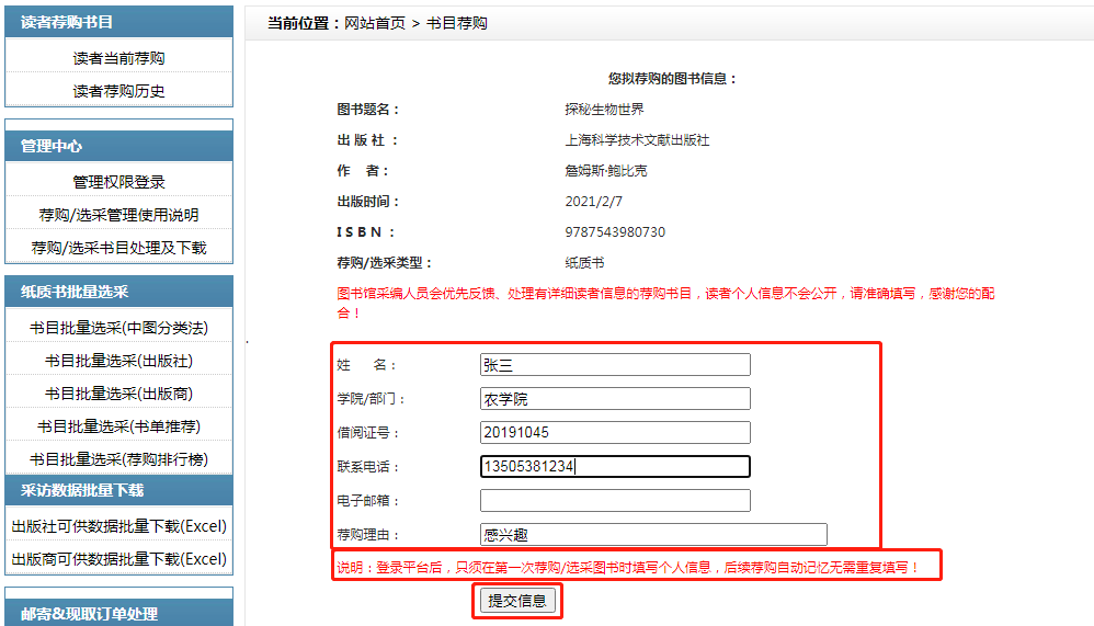 选择想要荐购的图书,点击“纸质书荐购”,填写个人信息(必填“姓名”、“学院/部门”、“借阅证号”、“联系电话”),点击“提交信息”,出现荐购反馈信息:若荐购图书无馆藏,则显示“荐购成功”;若荐购图书已被他人荐购过或有馆藏,则显示“此书目已经被荐购” 或“所荐购的图书目前已有馆藏”。