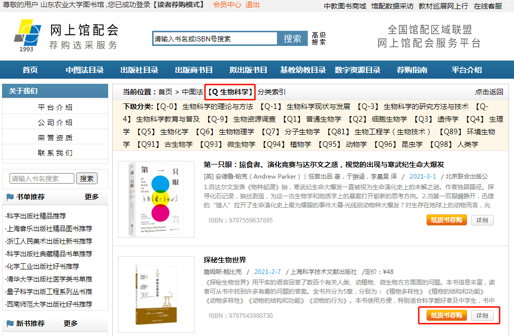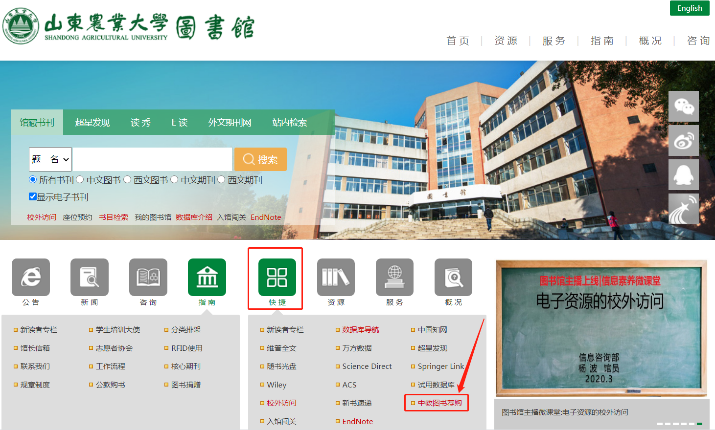 4.所荐购图书将分批到馆加工,待荐购图书进入借阅环节,图书馆将通过“山东农业大学图书馆”微信公众号及图书馆主页公告及时公布可借阅图书信息,供师生借阅。