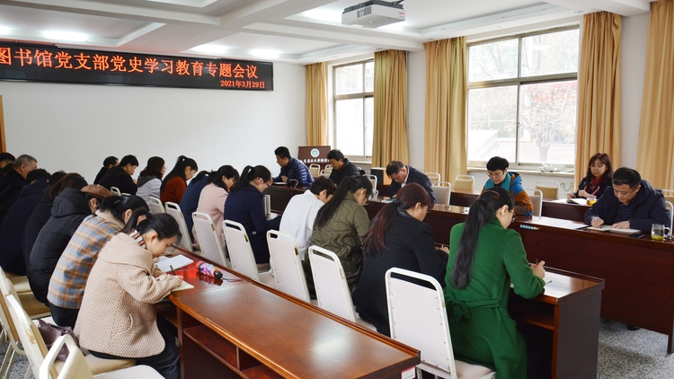 3月29日下午,图书馆党支部召开全体党员会议,深入学习贯彻习近平总书记在党史学习教育动员大会上的重要讲话精神和省委、省委教育工委、学校要求,在全馆上下迅速掀起党史学习教育热潮。