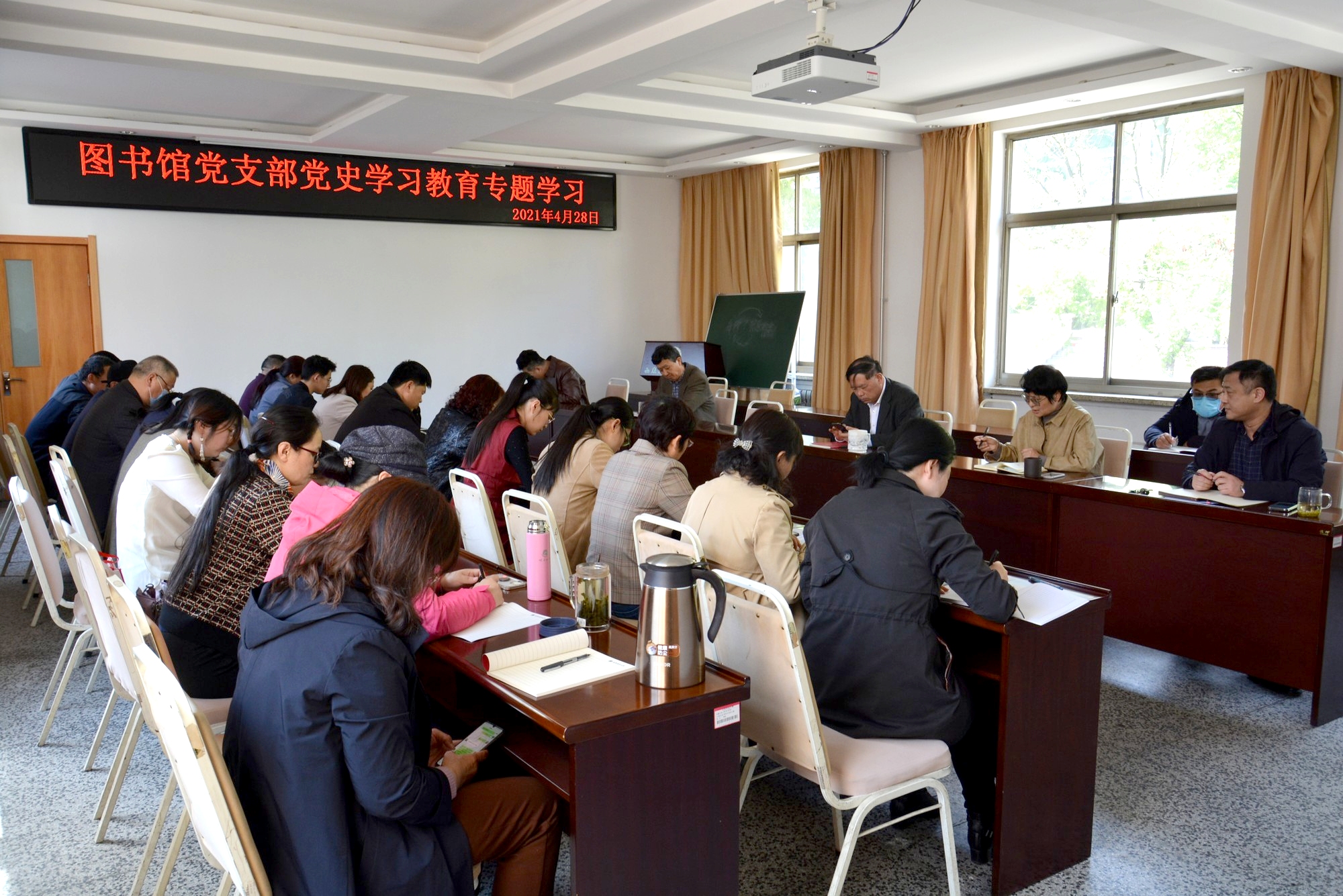 4月28日下午,图书馆党支部全体党员在图书馆会议室,召开图书馆党支部党史学习教育专题学习活动。会议由支部书记厉春宣主持,强调严格学习要求,突出问题导向,把学习党史作为本年度党员培训的主要任务,教育引导全体党员做到学史明理、学史增信、学史崇德、学史力行。