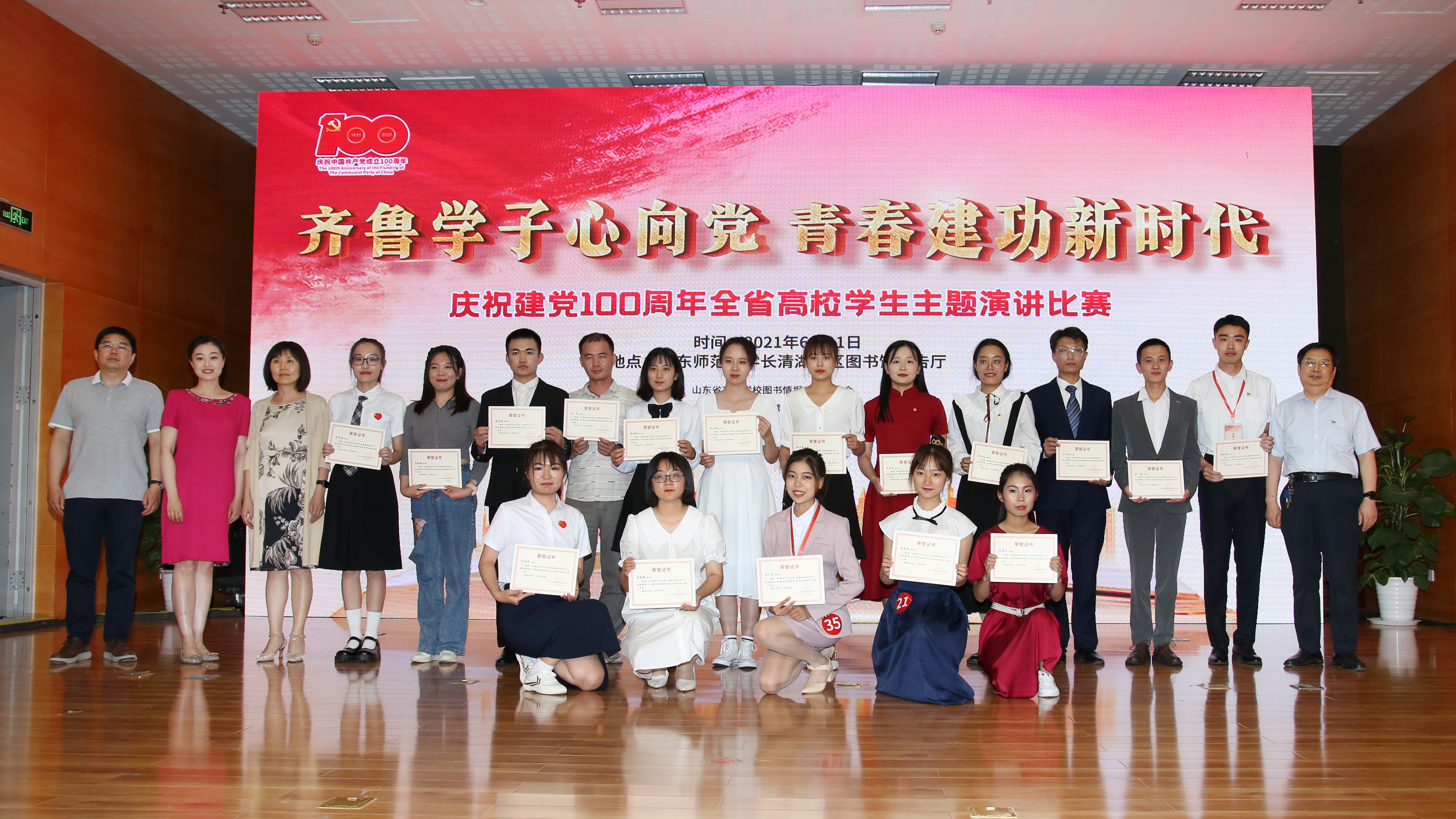 6月11日, 由山东省高等学校图书情报工作委员会主办的“齐鲁学子心向党 青春建功新时代” 庆祝建党100周年全省高校学生主题演讲比赛在山东师范大学长清湖校区图书馆圆满落幕,全省共35所高校参加比赛。我馆选送的林学院学生宋明慧荣获大赛“三等奖”, 施会萍等荣获“优秀指导教师奖”,图书馆荣获“优秀组织奖”。