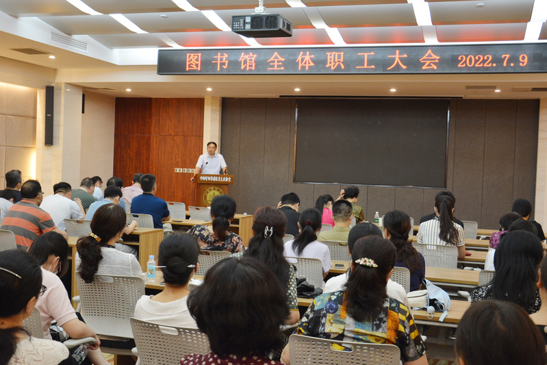 7月9日,图书馆在国重楼学术报告厅召开全体职工大会,馆长盖会全主持会议,副馆长厉春宣、于军生分别总结上半年工作情况,部署假期工作安排。