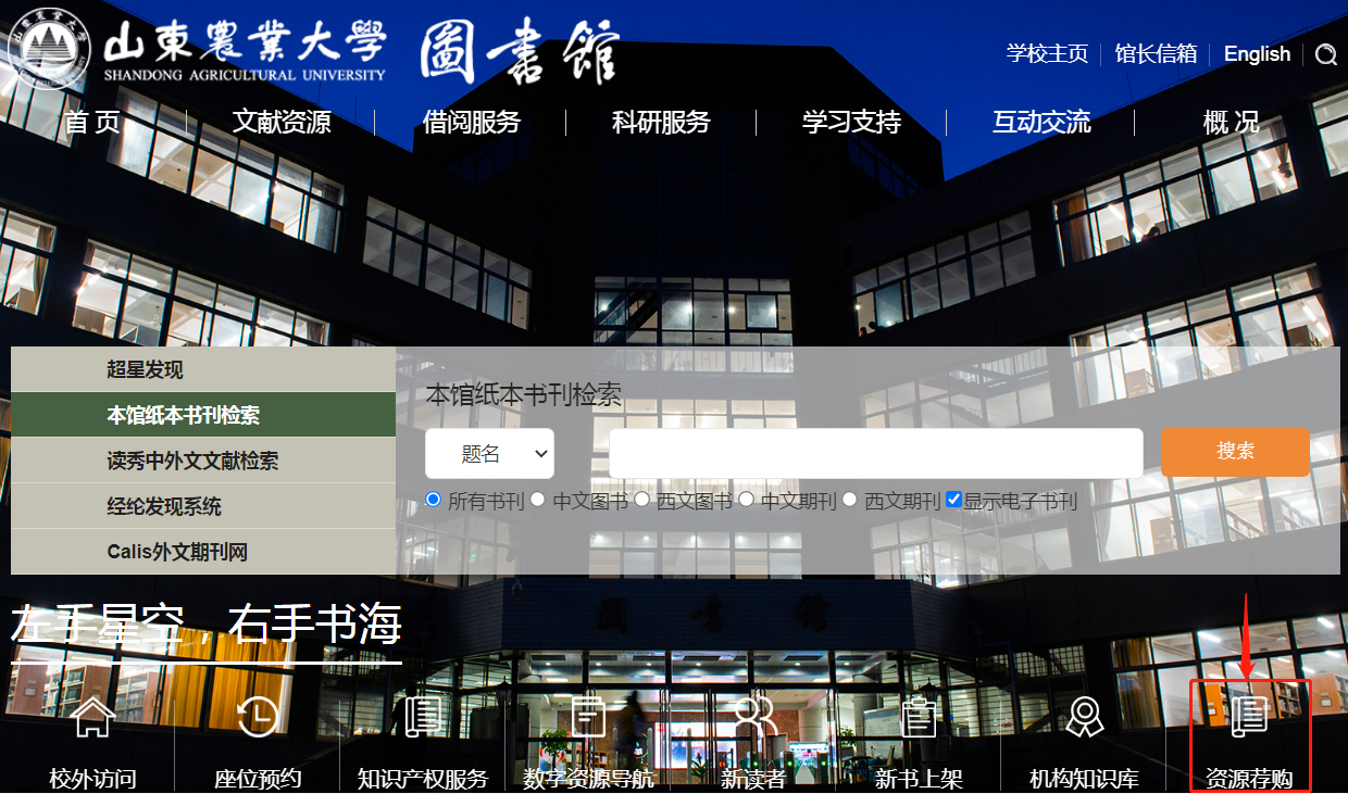 访问图书馆主页检索框下方的“资源荐购”栏目,可选择中文纸质图书荐购、外文电子图书荐购。对于外文图书荐购,需注意在校园网内可直接访问,无需注册;在校园网外,需通过图书馆首页的“数字资源导航”模块,登录智慧校园账号密码,找到“易阅通电子书平台”,即进入外文电子图书荐购平台。