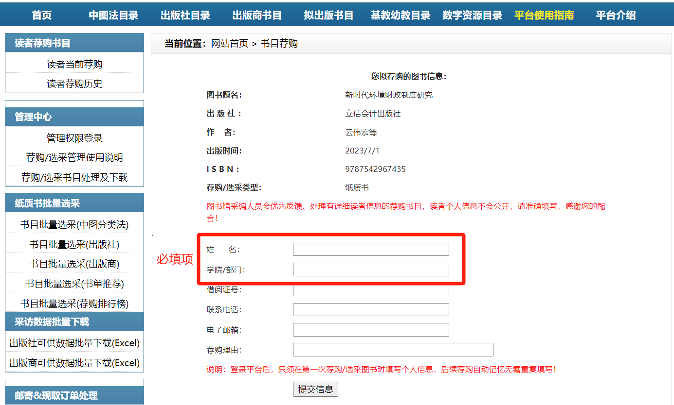 2.中外文荐购平台需提交荐购人姓名和学院信息。
