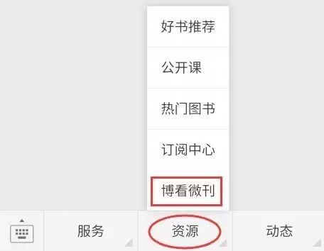 1.点击微信公众号“资源”菜单栏下的“博看微刊”。