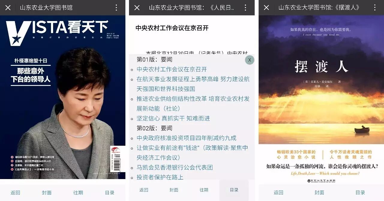 博看期刊在原有PC版远程包库服务的基础上,借助强大的微信公众平台,将4000多种精品期刊,5000多种畅销图书,及知名报纸内容进行多次加工处理之后,以便捷的使用形式,更高的清晰度画面,顺畅的浏览速度,给读者带来最佳的阅读体验。