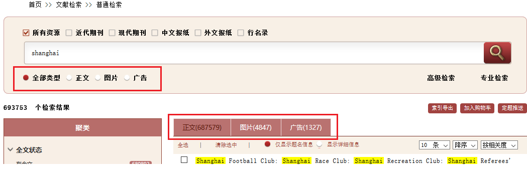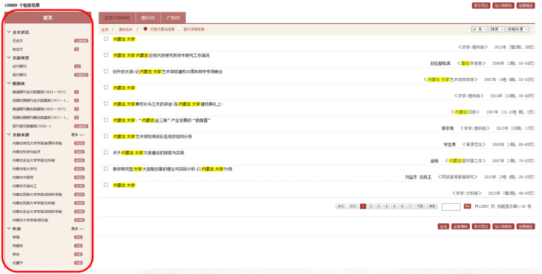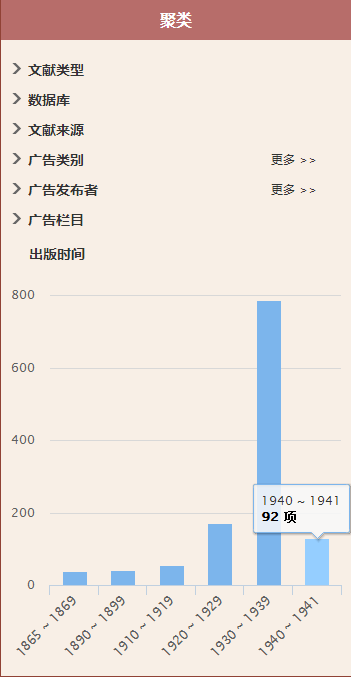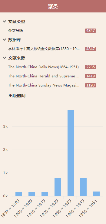 数据库将检索结果按“数据库”、“文献类型”、“文献来源”、“作者”等聚类项进行文献聚类,方便用户快速寻找相关信息,提高检索效率。