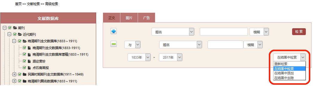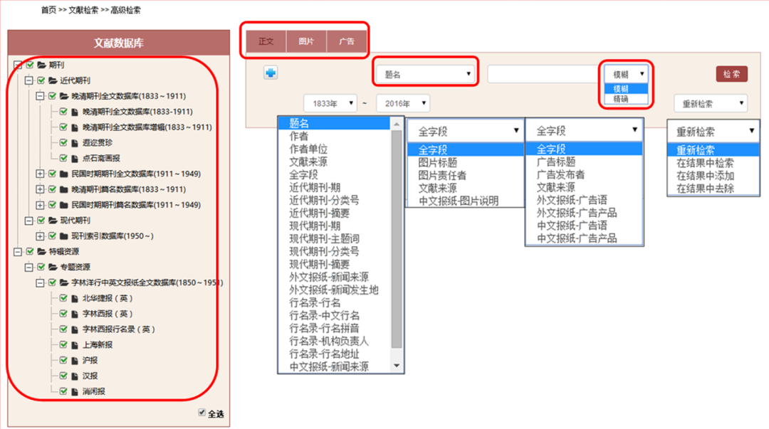 可根据检索需要,精确勾选所需数据库,设置检索文献的时间段限制,选择“模糊”或“精确”等高级检索。
