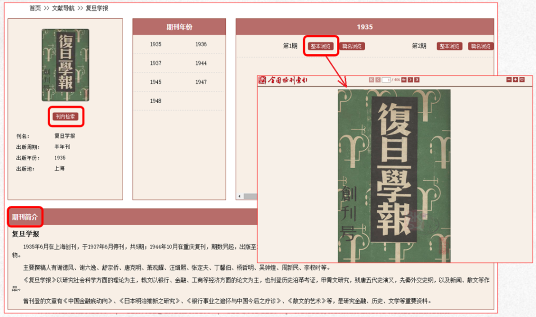 点击某期杂志(或某天报纸)的“整本浏览”按键,进入该期(或该天)的文献整本浏览阅读页面。通过此项功能可一览文献的全貌与版本。