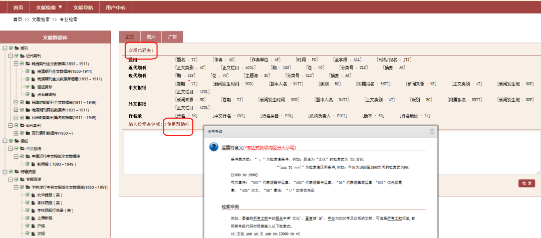 专业检索是使用逻辑运算符和检索词构造检索表达式进行检索。在专业检索时,参考数据库提供的各类文献的字段代码,利用字段代码结合字段间的布尔逻辑算符,组成正确的检索式直接输入检索框,即可显示所需检索结果。