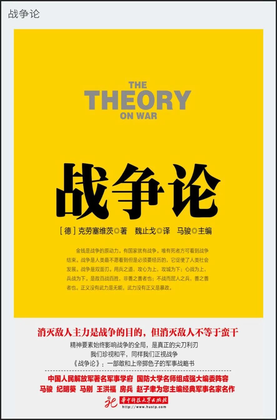 《战争论》 作 者:(德)克劳塞维茨著 出版社:华中科技大学出版社 《战争论》是一部运用辩证方法全面论述战争基本原理的资产阶级军事经典著作。首次把西方军事思想综合成为一个具有内在联系的理论体系;为战略决策,即国家政府部门及军事统帅如何对未来战争实施正确的战略指导、制定战争计划,最终取得战争胜利,提供了一套科学的方法,大大推动了军事科学的建立与发展。 战争论 |