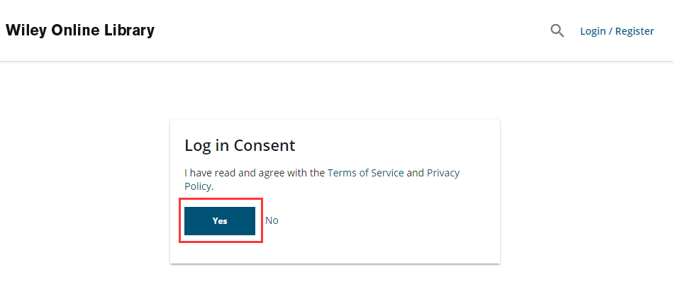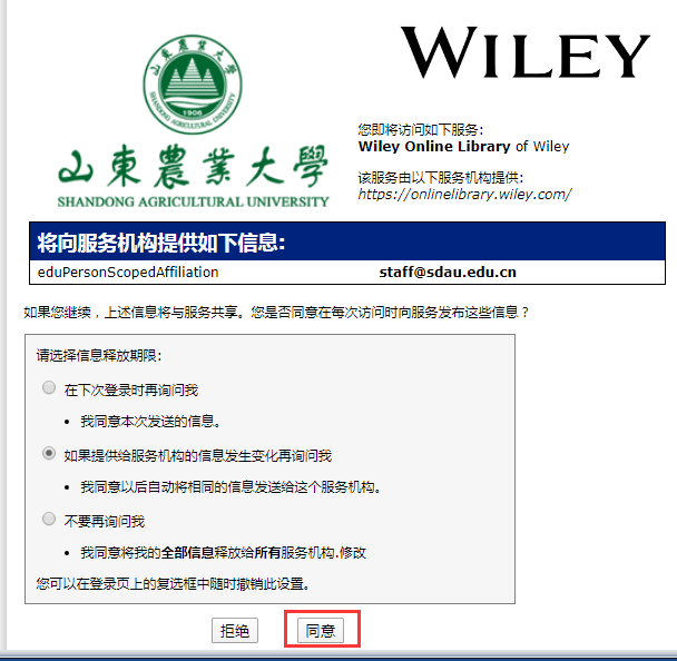 第四步,登陆成功后,第一次使用会出现登录信息共享许可,点击“同意”,再点击“Yes”,就进入Wiley数据库。