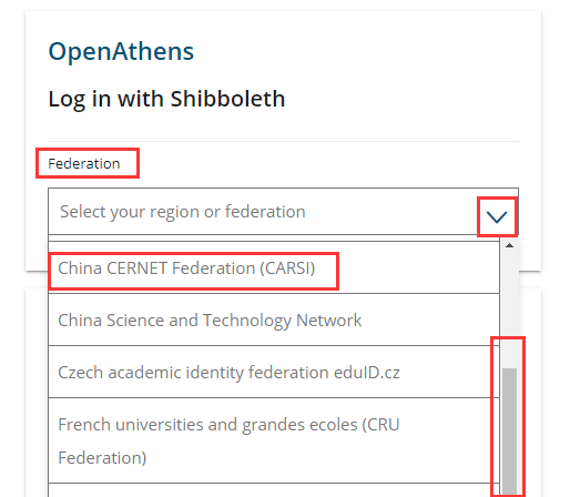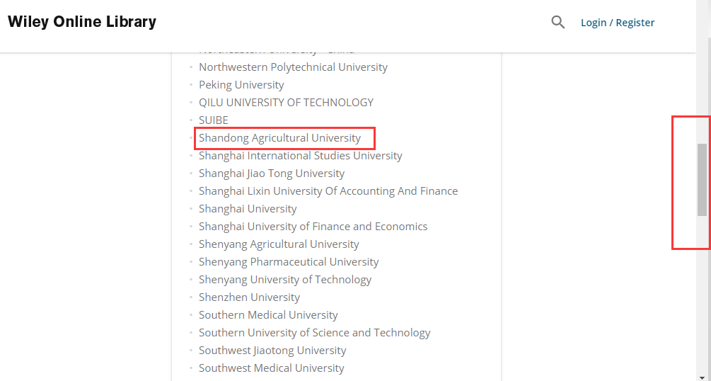 第二步,在WILEY 机构登陆页面,点击“Login with Shibboleth” 下的“Federation”下拉框,选择机构所属联盟“China CERNET Federation”,之后在联盟下找到并点击我校英文机构名称“Shandong Agricultural University”。