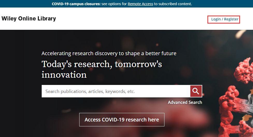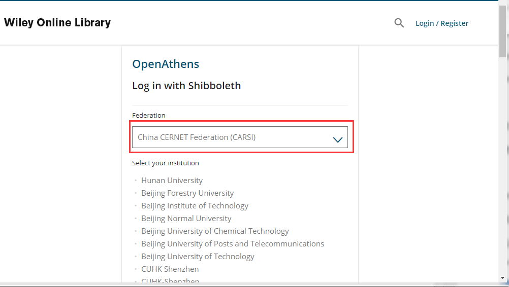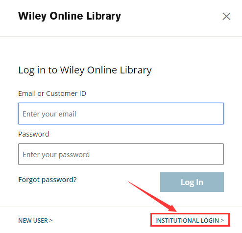 https://onlinelibrary.wiley.com/。点开右上角角“Login / Register”链接,在跳出的登陆界面里,点击右下方“INSTITUTIONAL LOGIN”,进入WILEY 机构登陆界面。