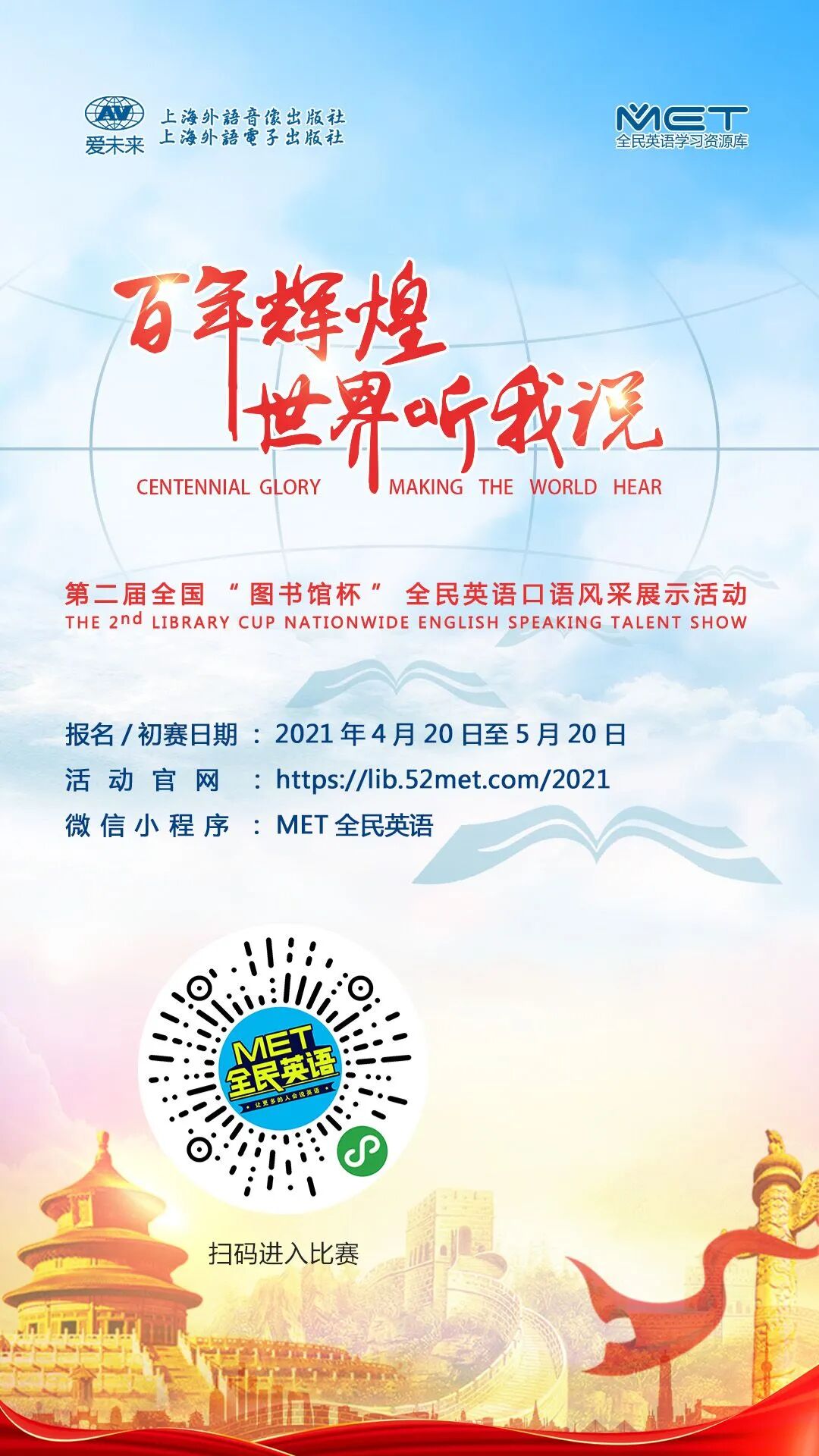 为庆祝中国共产党成立100周年,讴歌中国共产党走过的百年征程,向世界讲述中国故事。同时,更好地发挥图书馆学习基地的功能,展现图书馆多元化、数字化等新型服务手段,不断创新方式推广图书馆优秀外语数字媒体资源和服务,山东农业大学图书馆、山东农业大学校团委于4-6月开展第二届全国“图书馆杯”全民英语口语风采展示活动。