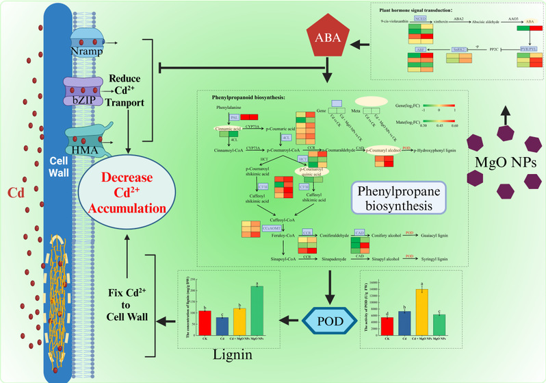 近日,植物保护学院烟草团队在Journal of Hazardous Materials在线发表了题为“Integrated physiological, transcriptomic, and metabolomic investigation reveals that MgO NPs mediate the alleviation of cadmium stress in tobacco seedlings through ABA-regulated lignin synthesis”的研究论文。山东农业大学为该论文的第一单位,秦孟展硕士为该论文的第一作者,刘朋副教授为该论文的通讯作者。镉(Cadmium)对农业的危害是严重而持久的,如何减少镉对农作物的危害是一个重要课题。植物降低镉毒性的方式大致可分为两部分:一方面,减少镉吸收和转运。这主要通过降低相关基因的表达来实现。另一方面,将游离的镉固定减少它的流动性。在这过程中细胞壁作为第一道防御起着非常重要的作用。本研究通过使用氧化镁纳米材料(MgO NPs)来减少水培条件下镉对烟苗的损害并深入解析其中的机制。研究发现,MgO NPs可